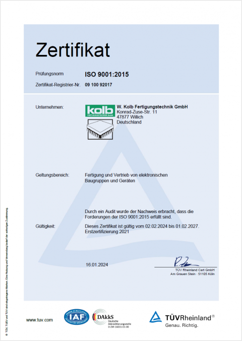 Der gesamte Lager- und Produktionsbereich der W. Kolb Fertigungstechnik GmbH ist DIN EN 61340 ESD-konform ausgestattet. Elektronische Zugangskontrollen stellen sicher, dass ausschließlich ESD-geschützte Personen diese Bereiche betreten.